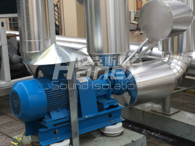 海寧四院住院樓平臺安裝有一組中央空調外機,空調正常開啟狀態(tài)下層辦公區(qū)及病房區(qū)測量噪聲值達56分貝。漢克斯隔音設計1.空調機組減振(空調減震器),2.進水管道減振,達到空調開啟時下層病房內夜間測量值低于40分貝。